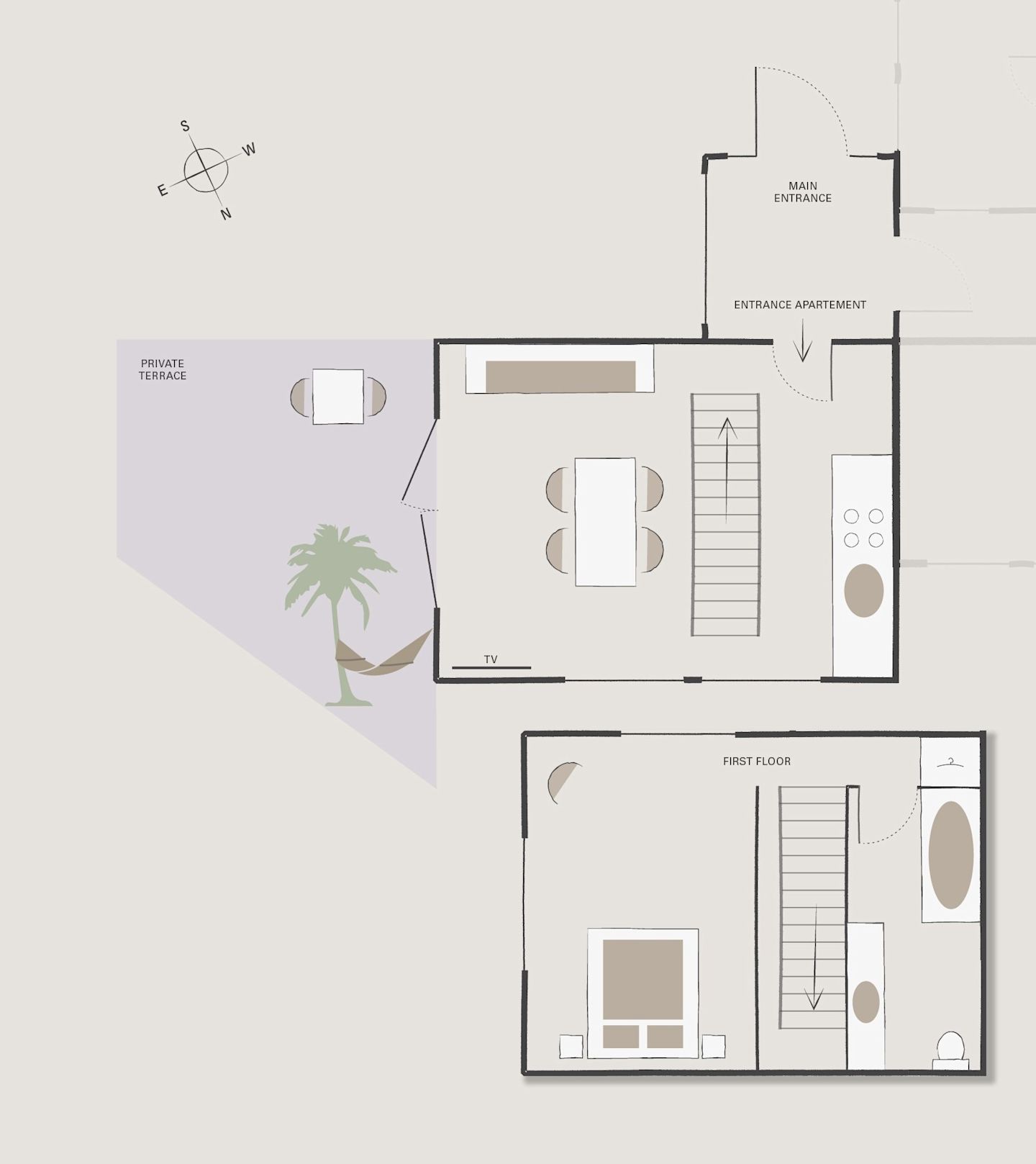 This unique apartment combines modern design with the cosy look and feel of the original wooden details. We re-arranged the layout and exposed the original rock walls. Around the free-standing stairs emerges a lofty gallery, connecting the upstairs bedroom with the downstairs living space and kitchen where a large glass wall opens to the private, East-facing terrace.