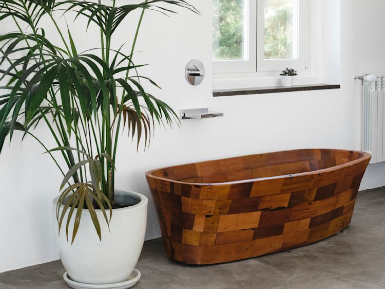 Two steps extend over the entire width and separate the living and dining area from the slightly higher sleeping area with the double bed and the hand-made wooden bathtub. We created the unique piece using the mahogany wood of ca 100 year old wine barrels we found in an old winery in the area. It might well be our favorite spot of the Pool House. Needless to say that the horizon of the ocean horizon is in sight from there.